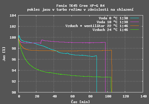 Pokles jasu v Turbo režimu jsem naměřil mezi 1 až 7 %, závisí na kvalitě chlazení. Pro měření ve vodě jsem svítilnu umístil do kýblu s vodou (s reflektory nad hladinou, jinak jsem měl problémy s usazováním bublinek na sklíčkách a následném negativním ovlivnění měření). Vodu o teplotě 0 °C jsem vyrobil z 3 kg ledové drtě zmrzlé na -18 °C a dolité cca 5 l vody. Svítilna rychle rozpustila ledovou tříšť ve svém okolí a postupně začala vodu ohřívat. Voda se bez míchání nezvládala od okolního ledu dostatečně ochlazovat. Zub na křivce pro vodu teplou 10 °C je způsoben tím, že jsem cca 5 min vodu míchal a tím svítilnu lépe chladil.
